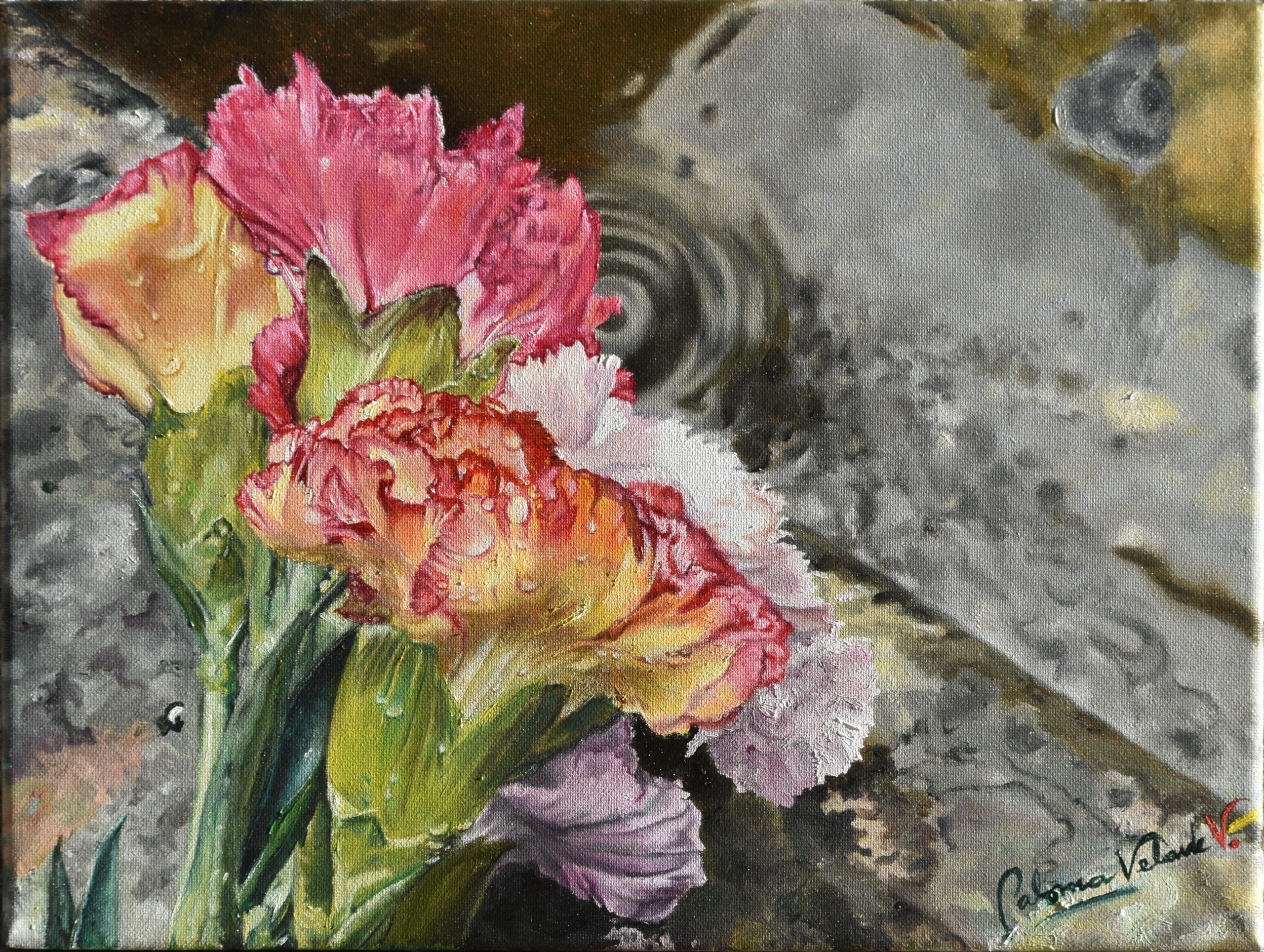 Una tarde de toros es toda ella , en sí misma, una pura incógnita. El buen o mal juego de los toros; la inspiración o falta de ella en los toreros; la inclinación a favor de obra del público, cambiante y caprichoso; el viento que tanto espanta a los que tienen que estar en el ruedo y que ellos llaman «aire»; y, por supuesto, el tiempo cambiante, sobre todo en primavera, cuando sorprende tantas veces una lluvia inclemente, que tantas tardes arruina. Y eso es lo que quiere plasmar esta pintura, la imagen de unos claveles, que representan la luz, colorido y fiesta en su mejor versión de una tarde de toros, mojados y solitarios en el tendido, sin haber logrado su propósito de ser el bello tributo a un torero, en su vuelta triunfante.